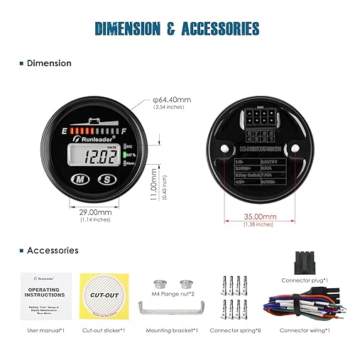 Runleader DC12V 24V 36V 48V Mini Battery Indicator Volt Meter for Lead Acid LiFePO4 Lithium Battery Powered Golf Cart Forklift Lawn Mower Scrubber Machine Motorhome etc.