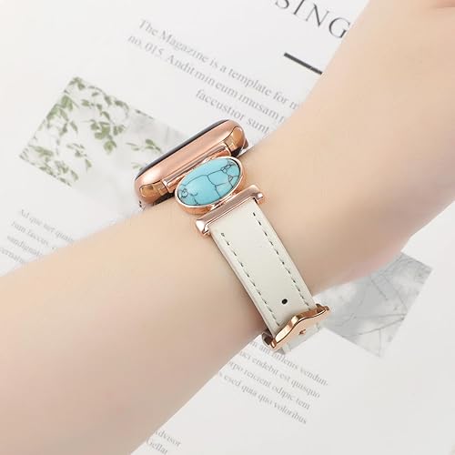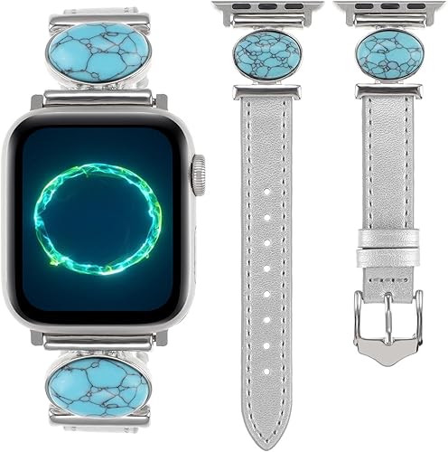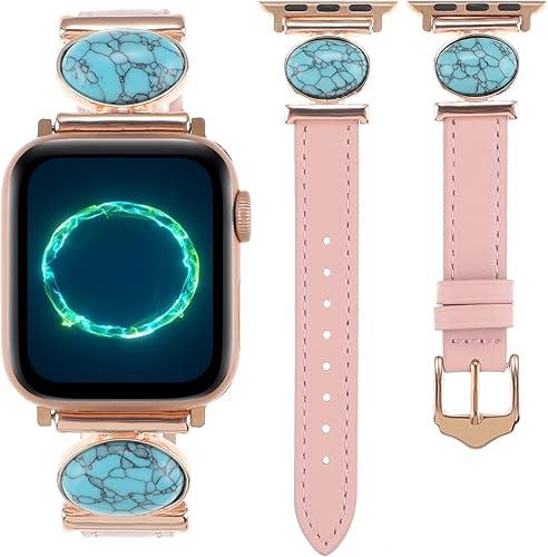Premium Material: Dressy apple watch band for women 44mm is made from high-quality leather, exquisite craftsmanship which is lightweight, breathable, soft durable and for all-day wear. Vintage turquoise stone decoration charms and classic leather strap perfect combination, Its unique and fashion appearance showcases your elegance and taste in both casual and formal occasions
