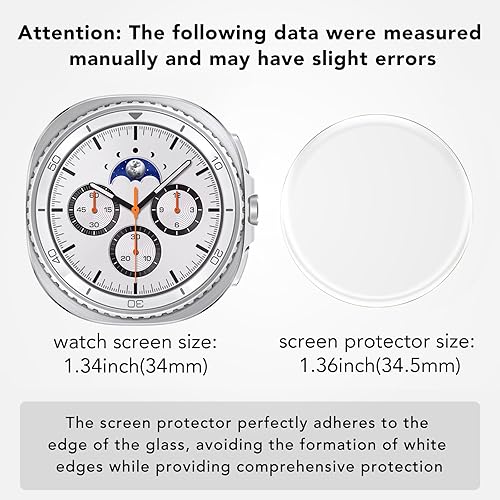 【Superior Scratch & Impact Resistance】 Made from high-strength tempered glass, this samsung watch 8 44mm screen protector offers 9H hardness to guard your galaxy watch 8 44mm against scratches, scrapes, and accidental impacts. The samsung watch 8 screen protector also features an oleophobic coating to resist fingerprints and dust.