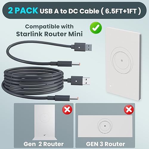 Starlink Router Mini Power Cable - 2 Pack (1 FT + 6.5FT) USB-A to DC Cable for Starlink Router Mini & Accessories, Plug and Play with 9V Quick Charge QC 3.0 Protocol(USB-A)